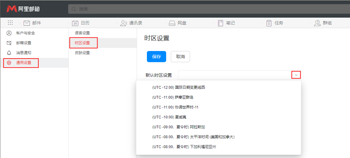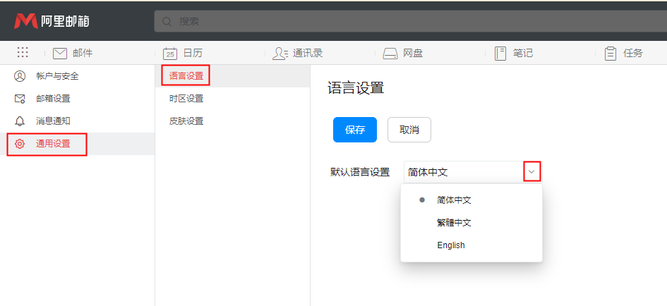 登录邮箱后点击右上角的设置图标>>通用设置>>语言设置,选择默认语言设置保存即可。点击时区设置可以选择需要显示的时区。